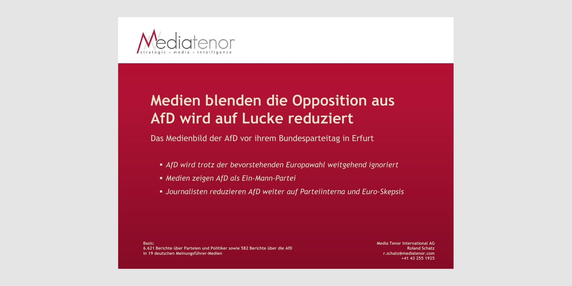 Zürich, 20. März 2014. „Nicht erst durch den Entscheid des Bundesverfassungsgerichts ist klar, dass die AfD bei der Europawahl den Einzug in das EU-Parlament in Straßburg erhalten wird. Dennoch wird ihren Inhalten von den Meinungsführer-Medien kaum Beachtung geschenkt“, kommentiert Roland Schatz, Gründer und CEO von Media Tenor International, die weitgehende Ausblendung der Alternative für Deutschland in der Berichterstattung deutscher Meinungsführer-Medien. Die Medienpräsenz bleibt erneut unter der Wahrnehmungsschwelle wie schon im Sommer vor der Bundestagswahl. Zudem reduzieren die Medien die Partei auf Interna und das Parteiprogramm auf Fragen zum Euro. Nicht zuletzt werden in erster Linie Kritiker zitiert, wenn die bisherige Arbeit der AfD in den deutschen Meinungsführer-Medien beurteilt wird. Neben Parteisprecher Bernd Lucke geben die Journalisten kaum einem anderen AfD-Politiker die Chance auf Darstellung der Partei – selbst Vorstandsmitglieder werden weitgehend ignoriert.