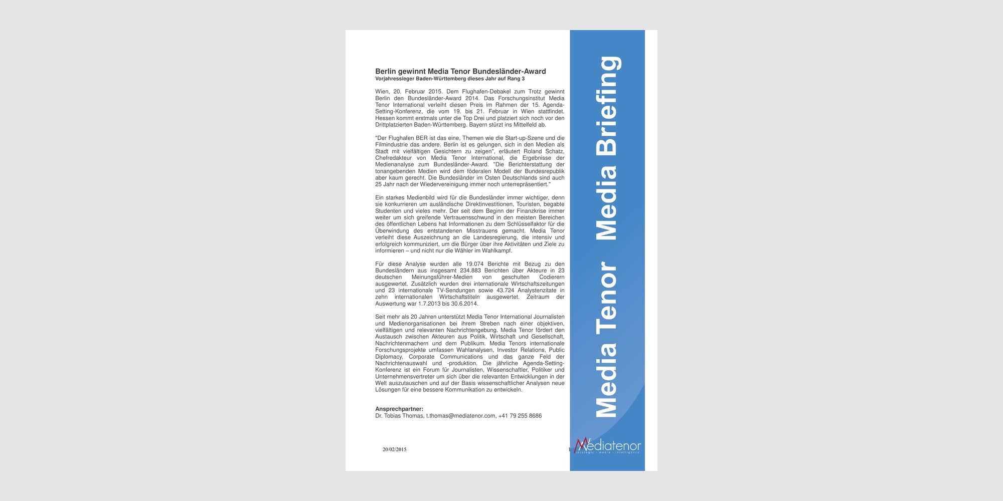 Vorjahressieger Baden-Württemberg dieses Jahr auf Rang 3 Wien, 20. Februar 2015. Dem Flughafen-Debakel zum Trotz gewinnt Berlin den Bundesländer-Award 2014. Das Forschungsinstitut Media Tenor International verleiht diesen Preis im Rahmen der 15. Agenda-Setting-Konferenz, die vom 19. bis 21. Februar in Wien stattfindet. Hessen kommt erstmals unter die Top Drei und platziert sich noch vor den Drittplatzierten Baden-Württemberg. Bayern stürzt ins Mittelfeld ab. „Der Flughafen BER ist das eine, Themen wie die Start-up-Szene und die Filmindustrie das andere. Berlin ist es gelungen, sich in den Medien als Stadt mit vielfältigen Gesichtern zu zeigen“, erläutert Roland Schatz, Chefredakteur von Media Tenor International, die Ergebnisse der Medienanalyse zum Bundesländer-Award.