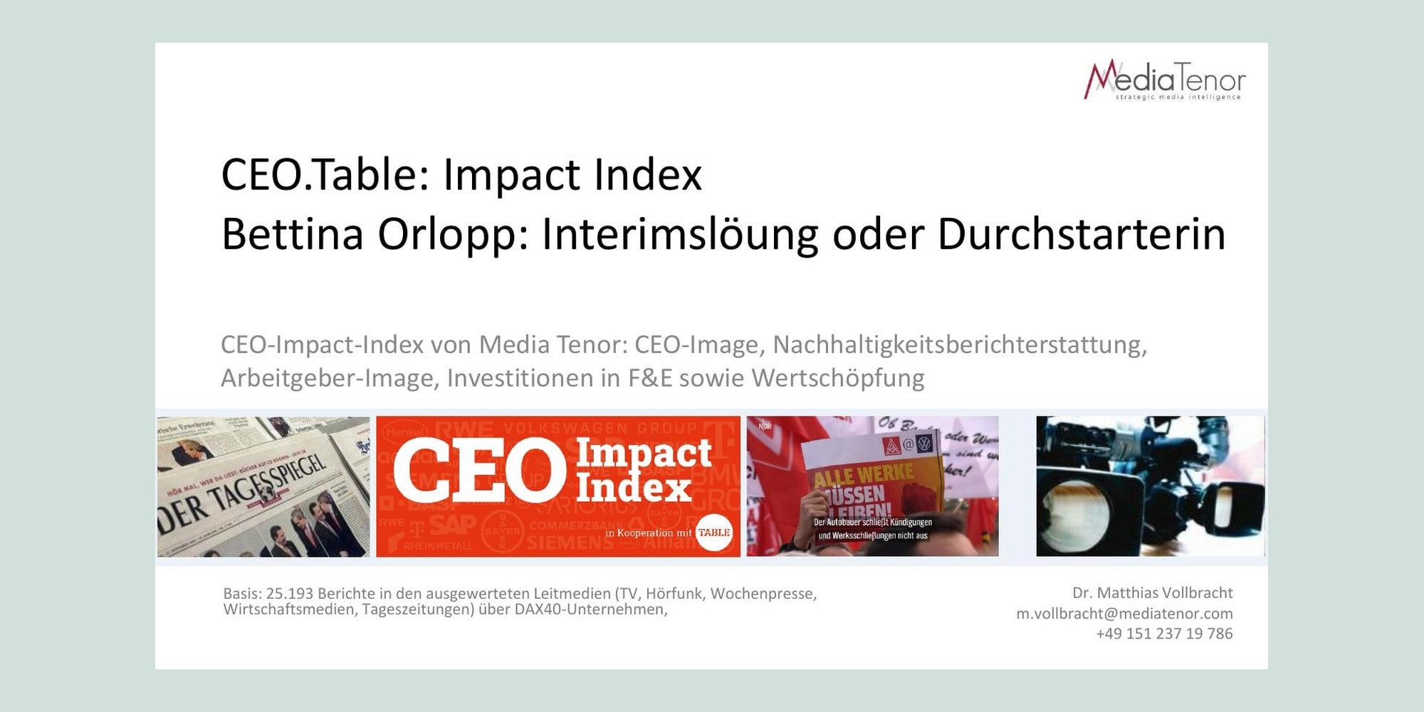 Mit 209 von 550 Punkten steht die neue Commerzbank-Chefin Bettina Orlopp im Table-Ranking der DAX-CEOs über der Wahrnehmungsschwelle noch auf einem der hinteren Ränge. Ihre Stärken: Ein deutlich positiveres Image in den Leitmedien als ihr Konkurrent von der Deutschen Bank und ein relativ guter Score beim Shareholder Value. Ihre Herausforderungen: strategischen Handlungsspielraum sichern, Arbeitgeberimage stärken.