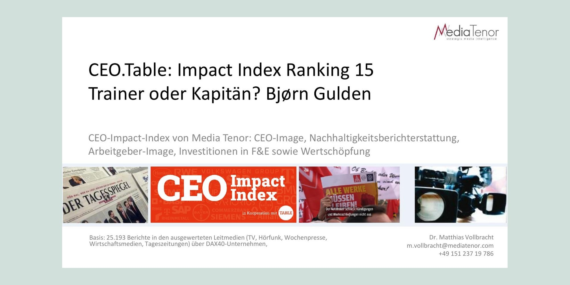 Bjørn Gulden ist im CEO.Table-Ranking 2024 in der Kategorie DAX40 einer der Hoffnungsträger. Mit 276 von 550 möglichen Punkten im CEO.Table-Ranking ist der Adidas-Chef vergleichbar mit Oliver Zipse oder Roland Busch im CEO-Ranking. Allerdings kommuniziert er bislang unterhalb der Wahrnehmungsschwelle. Er wird allerdings von den Leitmedien als großer Hoffnungsträger gezeigt. Diese Bewertungen wecken auch hohe Erwartungen. Bei seinem Vorgänger Rorsted führte das auf holpriger Strecke zum Image-Absturz.