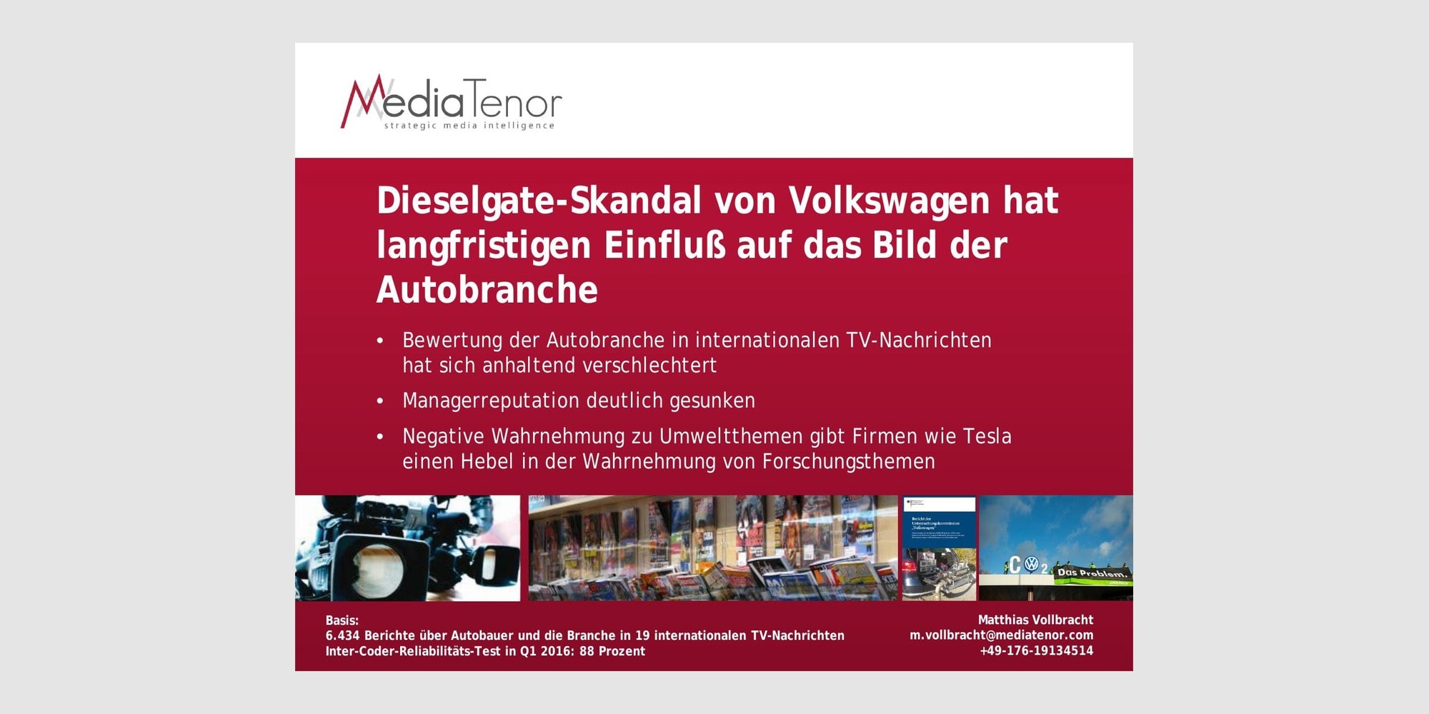 Zürich, 19. September 2016. Ein Jahr nachdem die US-Behörden gegen Volkswagen wegen Abgasmanipulationen bei Dieselfahrzeugen in die Öffentlichkeit gegangen sind, ist das Bild der Gruppe in internationalen TV-Nachrichten noch genauso negativ wie zum Ausbruch des Skandals (Überhang von 70 Prozent negativer über die positiven Wertungen). Dies ist eine negativere Darstellung, als Toyota sie während des „Selbstbeschleunigungsskandals” im Jahr 2010 erlitt und genau so negativ wie das Bild von BP während des Öl-Unglücks im Golf von Mexiko (2010). Der Volkswagen-Skandal hat mit seinen Abstrahlwirkungen das Branchenbild maßgeblich verändert und gibt Unternehmen wie Tesla einen starken Hebel, um alternative Antriebstechniken publik zu machen. Media Tenor International hat eine wissenschaftliche Inhaltsanalyse der TV-Nachrichten in den USA, Großbritannien Deutschland, Italien, Spanien, Frankreich, Schweiz, Österreich und anderen Ländern im Zeitraum Januar 2014 bis September 2016 durchgeführt und auch frühere Skandale innner- und außerhalb der Branche ausgewertet.