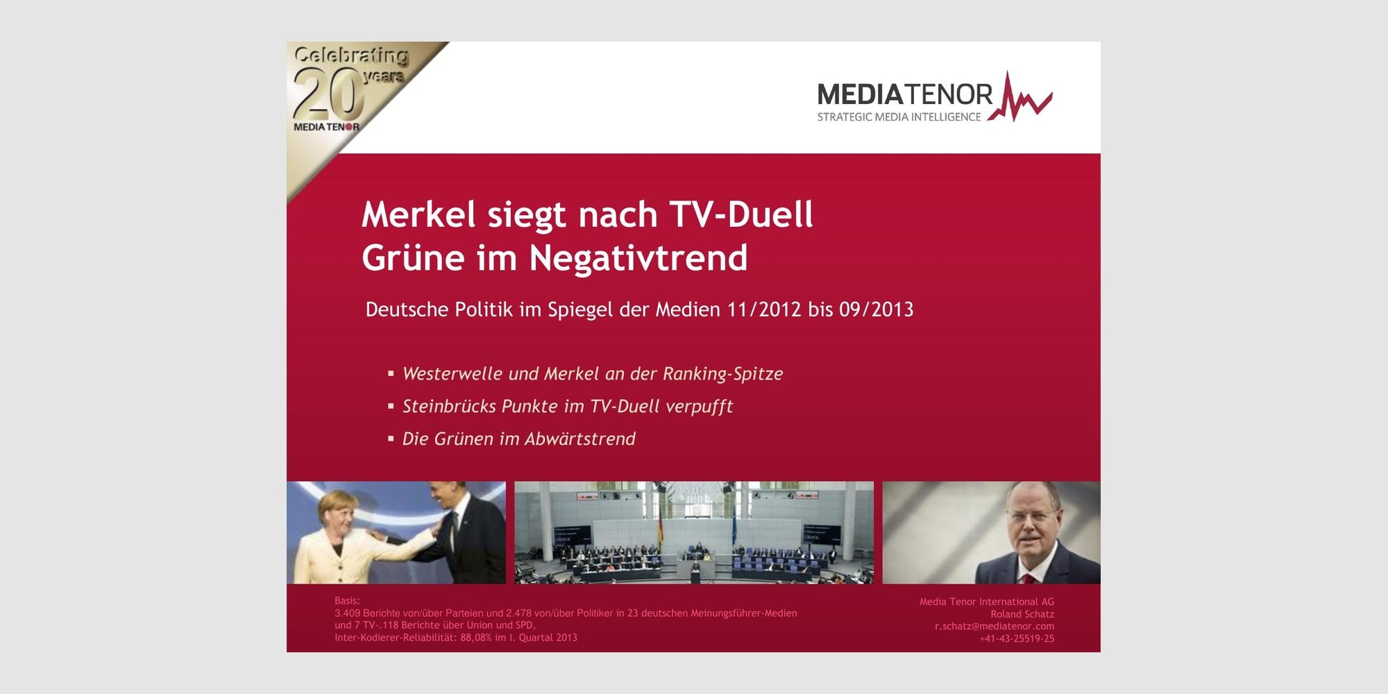 Die Kanzlerin rangiert auf Platz zwei. Der bayrische Landtagswahlkampf mit einer möglichen absoluten Mehrheit der CSU stabilisiert Seehofers Ranking. Trittin kommt unter die zehn meistgenannten Politiker, weil die Medien über einen Negativtrend für die Grünen berichten und stark an ihm festmachen. Schäuble haben seine Griechenland-Statements nachhaltig geschadet. Die negative Berichterstattung kennzeichnet weiter mit überwiegend schlechten Bewertungen alle Parteien. Die Union liegt in der Präsenz weiter klar vorn. Die Opposition hat NSA-Affäre und Griechenland-Aufreger nicht in Vorteile für sich verwandeln können. Ihrem Medienbild fehlen eigene Profilthemen. Media Tenor hat für diese Studie alle 3.407 Berichte über deutsche Parteien und 2.478 über Politiker zwischen dem 1. August und 8. September 2013 in 23 in deutschen Meinungsführer-Medien und alle 7.118 TV-Berichte über Union und SPD zwischen dem 12.11.2012 und dem 8.9.2013 ausgewertet. Die durchschnittliche Interkodierer-Reliabilität betrug im I. Quartal 2013 88,08%. D_Report_8_September_MerkelsiegtnachTVDuell.pdf Grafik der Woche