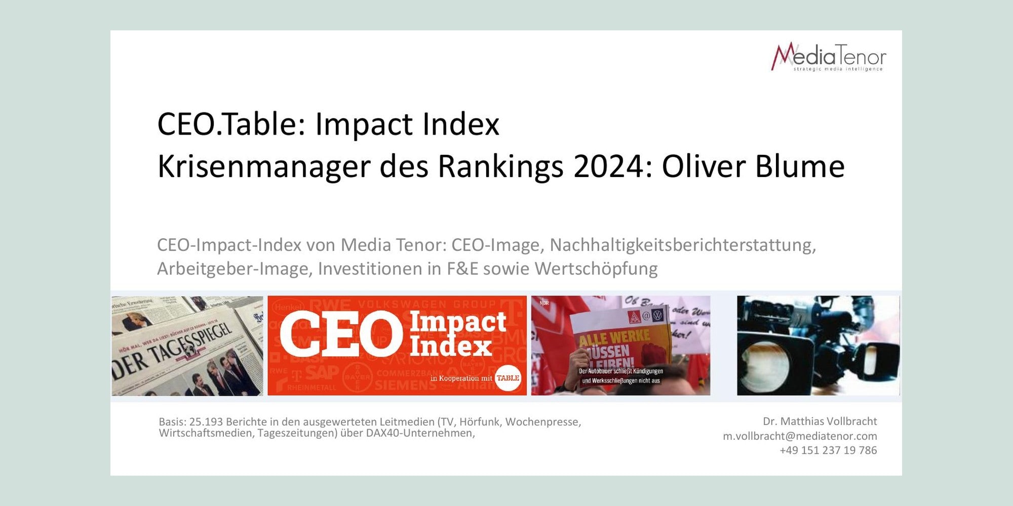 Mit 317 von 550 möglichen Punkten im CEO.Table-Ranking ist Oliver Blume unter den CEOs der DAX-Unternehmen derjenige mit der aktuell größten Aufgabe, aber auch enormen Ressourcen. Auf Oliver Blume lastet die Erwartung und ruht die Hoffnung, dass der wichtigste deutsche Autohersteller sich trotz der enormen Herausforderungen behaupten kann. Die Leitmedien sehen die Stärken von Volkswagen beim gewaltigen Aufwand für Innovation, der grundsätzlichen Attraktivität für den Nachwuchs verschiedener Wissensbereiche und – in Teilen – auch bei den Anstrengungen für Nachhaltigkeit. Oliver Blume hat dabei die Aufmerksamkeit der Leitmedien, eine wichtige Voraussetzung, um die strategische Neuaufstellung zu vermitteln.