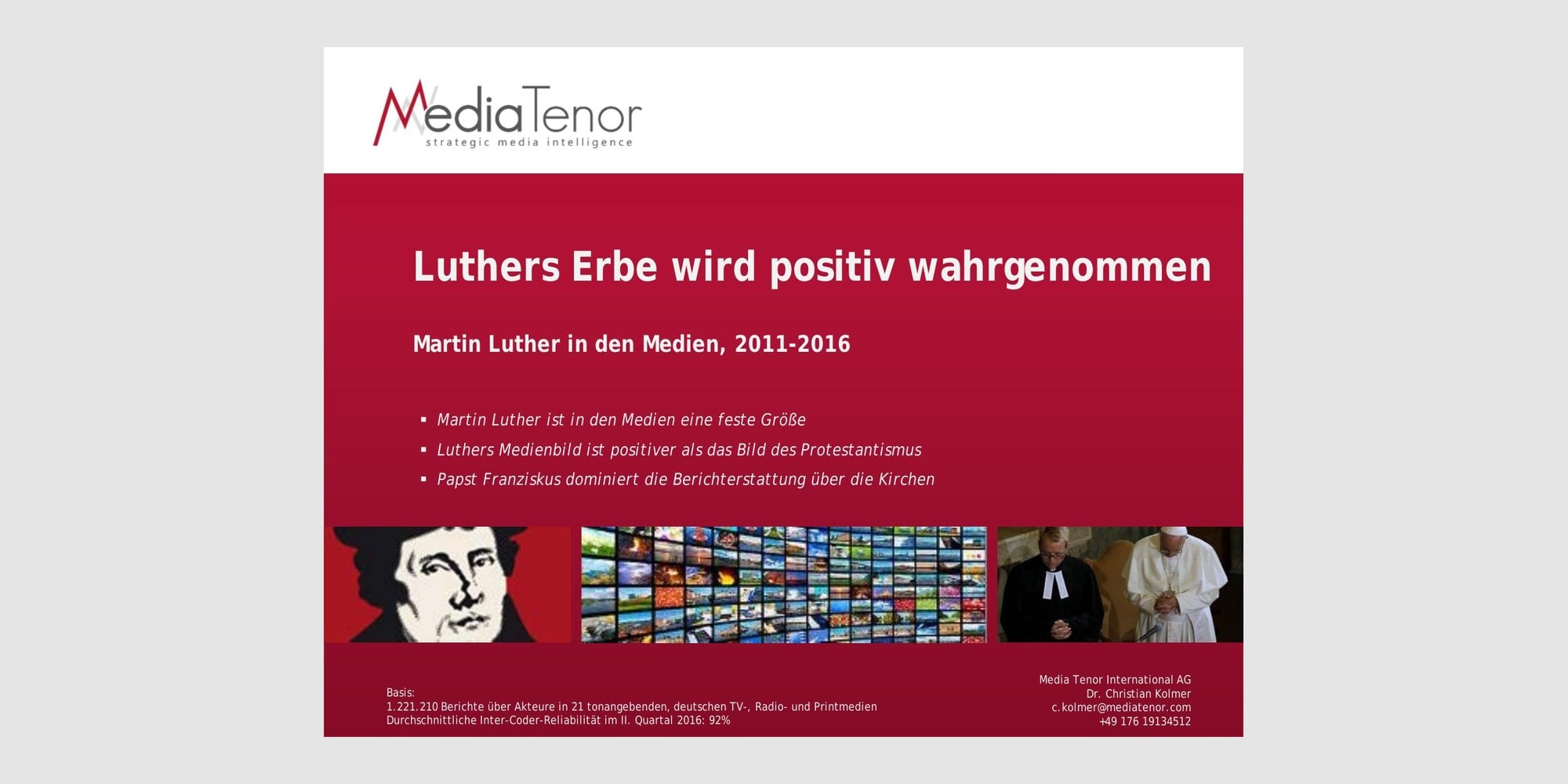 Martin Luther in den Medien, 2011-2016 Wien, 28. Oktober 2016. Am kommenden Montag beginnen die Feierlichkeiten zum 500 Jahrestag der Reformation. Die Erinnerung an dieses welthistorische Ereignis bleibt mit der Person Martin Luthers verknüpft, vor allem in Deutschland. In den vergangenen Jahren haben sich die tonangebenden deutschen Medien wieder stärker mit dem Wirken des Reformators befaßt. Eine Langzeitanalyse des Forschungsinstituts Media Tenor International zeigt, daß dabei die positiven Seiten des reformatorischen Erbes im Vordergrund standen. „Die Überwindung mittelalterlicher Verkrustungen und die Befreiung des Gewissens der Gläubigen werden in der aktuellen Mediendebatte – trotz der traurigen Folgen der Kirchenspaltung – positiv dargestellt“, erklärt Dr. Christian Kolmer, Leiter Gesellschaftsanalyse bei Media Tenor International. Auf der anderen Seite wurden die zeitbedingten kritikwürdigen Aspekte von Luthers Lehre und Wirken, vor allem sein in späteren Jahren stärker auflebender Antisemitismus, nicht ausgeblendet.