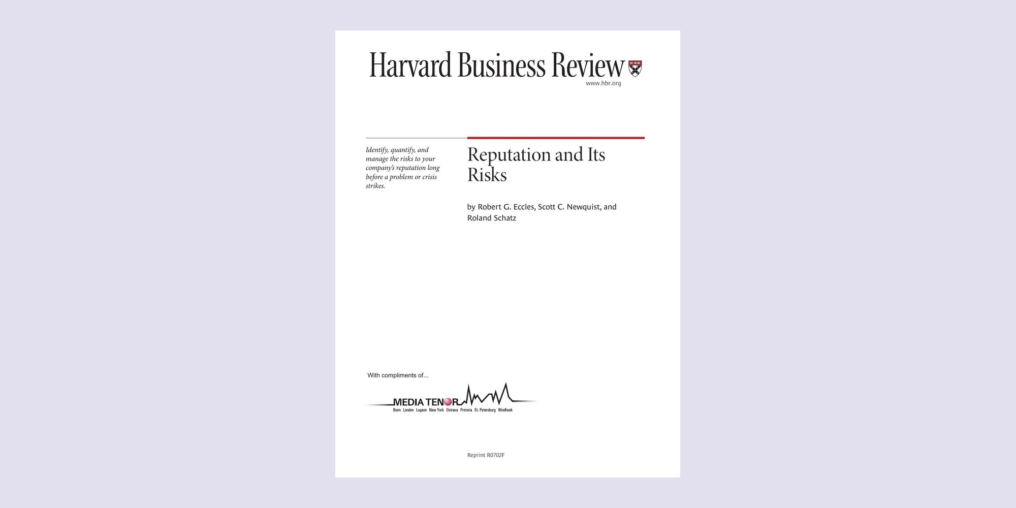 Scientific Contributions Reputation and Its Risks ByMediaTenor 06.09.202311.03.2026 Robert G. Eccles, Scott C. Newquist, and Roland Schatz, February 2007 Herunterladen: Reputation and Its Risks